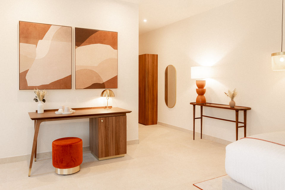 Des collaborations locales ont enrichi le projet, notamment avec les poteries Ravel, emblématiques d’Aubagne, et des luminaires sur-mesure créés spécialement pour La Bastide Bourrelly. Dans le hall d’accueil, une suspension unique parsemée de sphères rappelle les formes arrondies omniprésentes dans la décoration.